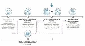 The Review process and timeline allow for extensive stakeholder consultation in developing the scope of the Review and detailed proposals for changes to the standards. There will be at least two formal consultation periods conducted on the: